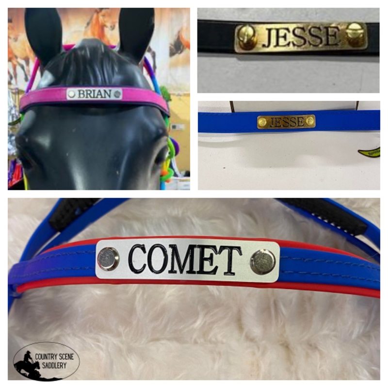 Horse Browband ~ Australian MadeLet Your Horse Stand Out From The Crowd. We can Make These BrowBands In A Huge Colour Range.Made In Tough Wipe Clean PVC.Tough PVCNow with Name Tag in either Brass or Silver Please Enter The Name As You would Like It In Order Details.Capitals or Lower Font. (Please Allow 10 days)