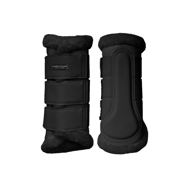 High quality brushing boots with an all-round fit, designed in an elegant black with silver details. Made from synthetic PU leather with a matte finish. Soft teddy on the inside against the horse's legs. Elastic Velcro straps with the stylish Equestrian St