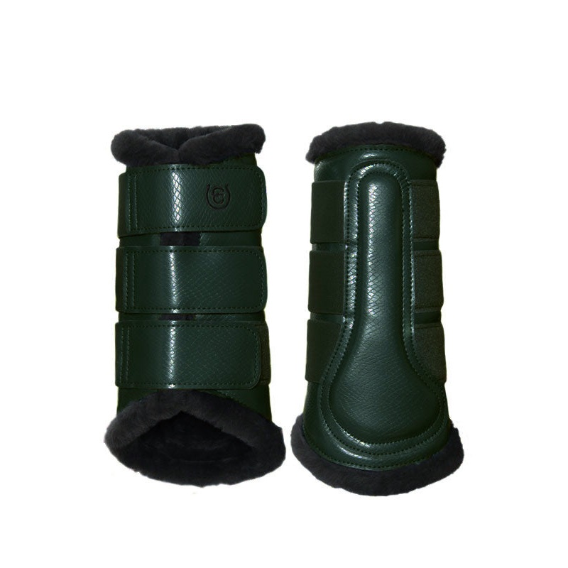 High quality brushing boots with an all-round fit, designed in a dark green color and black teddy. Produced in shiny synthetic leather with crocodile imitation. Soft teddy on the inside against the horse's leg. Elastic Velcro closings with the stylish Eque