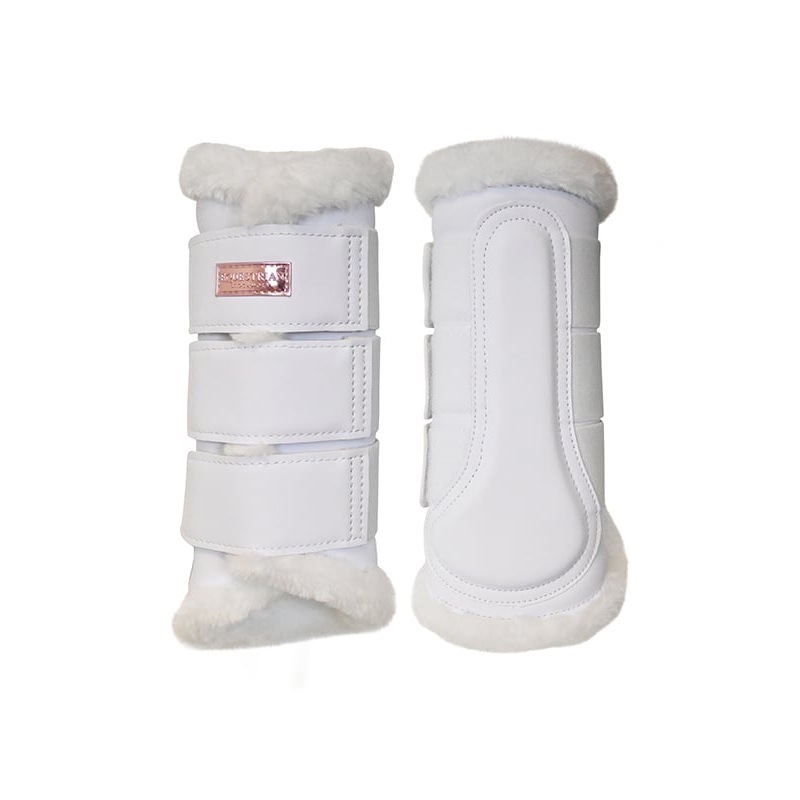 High quality brushing boots with an all-round fit, designed in a classic white with rose gold details. Made from synthetic PU leather with a matte finish. Soft teddy on the inside against the horse's legs. Elastic Velcro straps with the stylish Equestrian