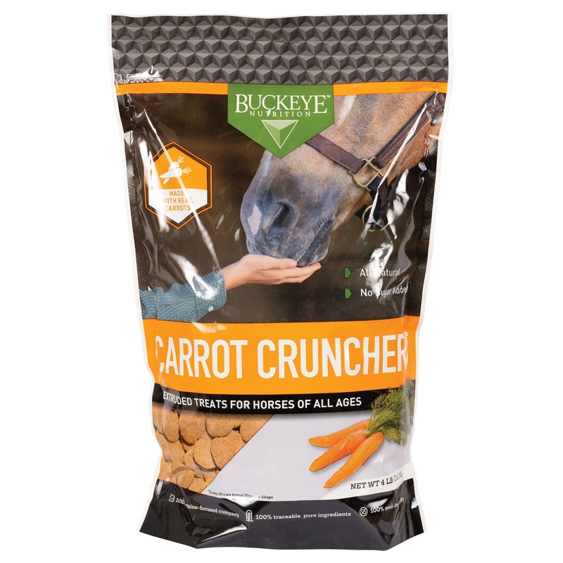 Buckeye Nutrition's All Natural No Sugar Added Carrot Crunchers are made with real carrots, and do not contain additives, preservatives or artificial flavourings. Treat your horse with the most wholesome and nutritional reward. Resealable bag. 4 lb.No adde