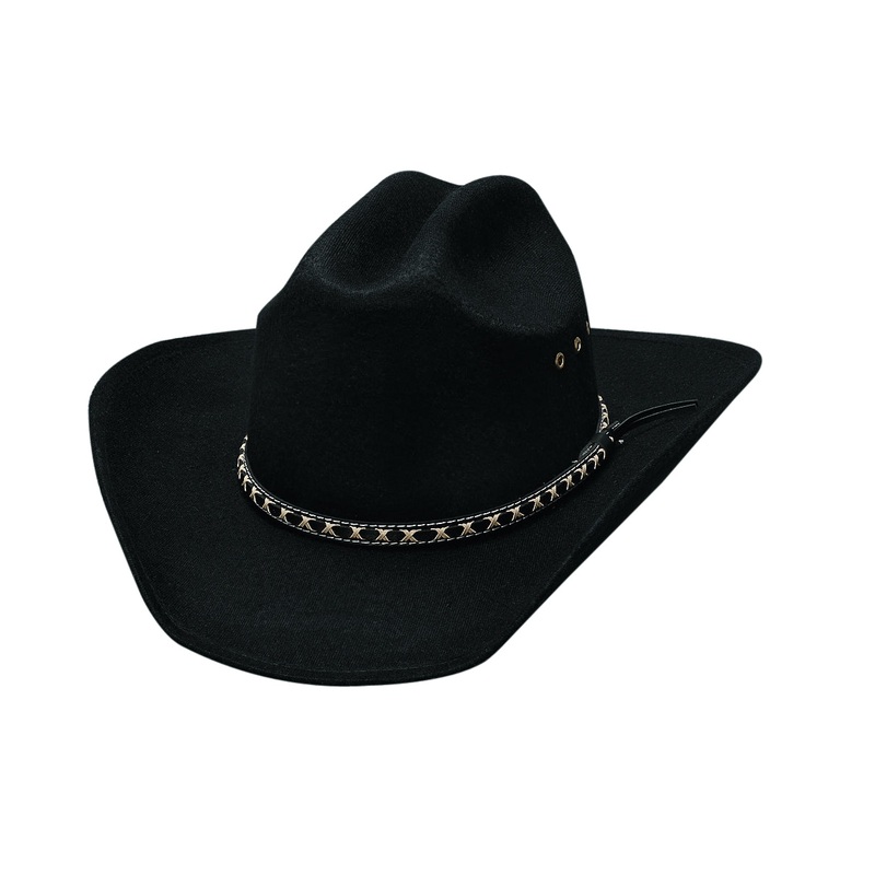 Cowboy Hero is a soft faux Felt cowboy hat that boasts a cattleman crown, and a self matching hat band with criss cross accents. One Size Fits Most. 3 1/4" brim.Color:Black