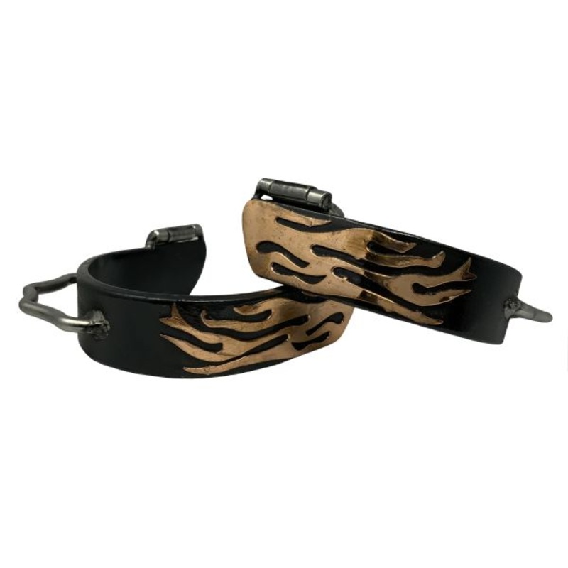 These spurs are made from high-quality black steel, which is known for its strength and resistance to wear and tear. The copper flame overlay adds a touch of color and style to the design, making these spurs perfect for riders who want to make a statement