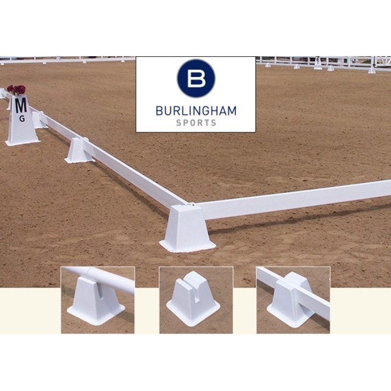 The Wellington Arena features a set-in design that is user friendly for set up. The rails are pre-measured so you simply place the 4 meter (157 1/2″) rail into the supports which assures perfect increments every time. The Wellington supports are made with white UV stabilized polyethylene. The 100% UV treated material is super tough and durable and will withstand abuse and all weather conditions. The Wellington Arenas are very stable in high wind areas. We use ribbed rails (not hollow) that are made of 100% UV resistant PVC. Ribbed rails add strength, durability and rigidity. The Wellington Arena uses 1 1/2″ x 5 1/2″ rails that make the height the required 12″. The supports (Cones) are also sold separately and designed to house round rails. If you choose, you can set up your arena using fence rails or jump rails you have on hand. The Wellington Trainer allows you to make a full size course with fewer rails placed for training giving this unique design many advantages not found with other arenas.