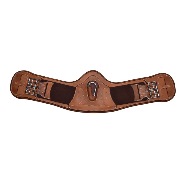 The Butet embossed curved comfort dressage girth comes with a central snap hook and four double roller buckles at the ends. The curved comfort dressage girth is compatible with our mono-flap saddles.