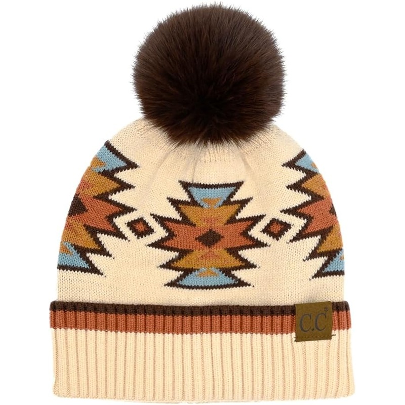 C.C. Brands hasawesomebeanies & headwraps. Thisbeanie is so soft and colorful. It is a dark berrywith multi-color Aztec print and has fluffly pompom. C.C. Brandswillkeep you cozy.Colorful Southwest PrintFluffy PomPom47% Rayon / 31% Polyester / 22% NylonPom