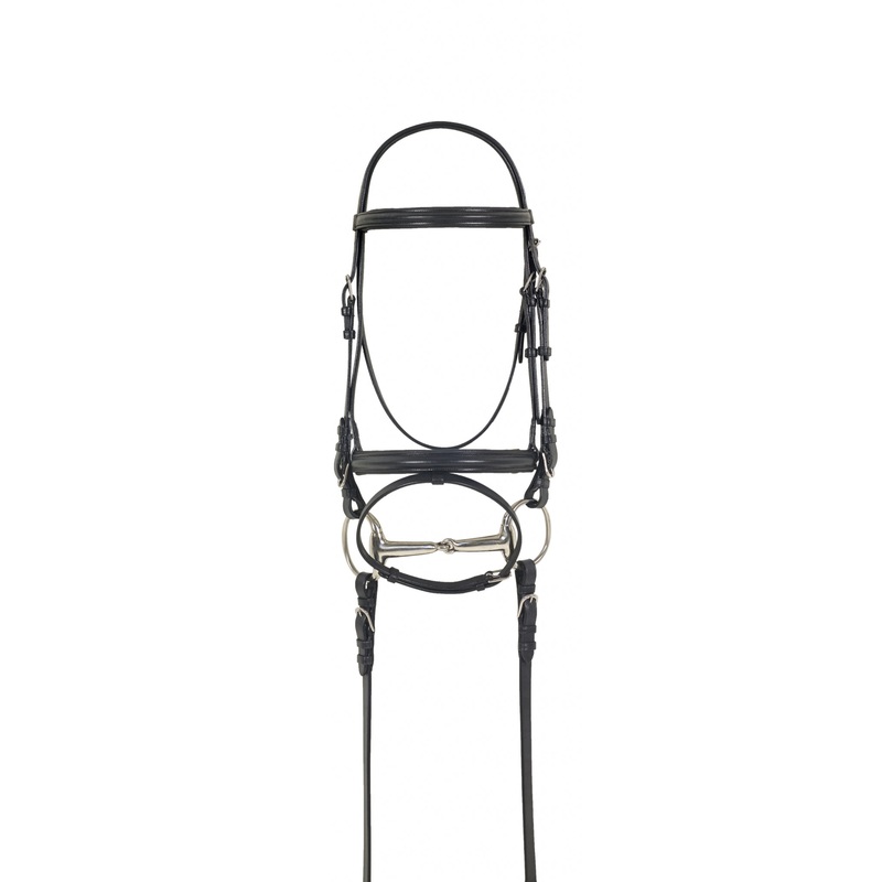 Best value for the money in a practical and durable dressage bridle with black leather lining, anti-slip web reins with buckle ends.