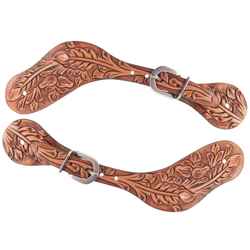The Cashel Antique Leaf Tooled Spur Straps with stainless buckles are a durable and versatile accessory for cowboys. These spur straps are made from skirting leather that is lightweight while still built to last.