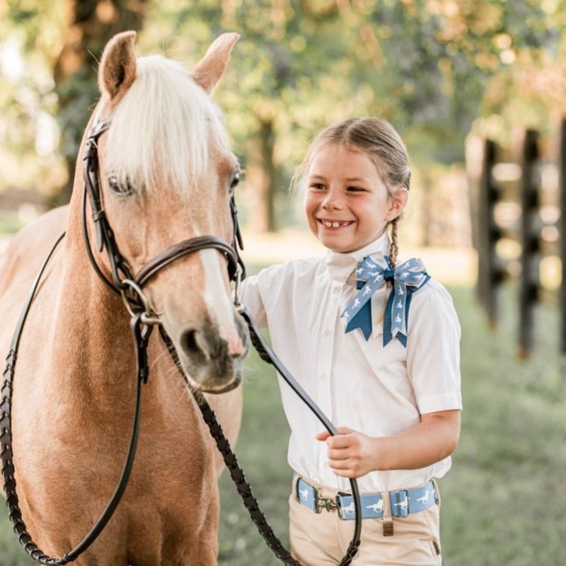 These triple layered bows are so fun, you’ll want to wear them to the barn and beyond! The beautiful super soft grosgrain ribbon bows feature one layer of navy ribbon, one layer of silver shine to add some subtle sparkle, and one layer of ribbon featuring the running horse print. With an elastic ponytail holder, you can easily wrap around your braids. They are made to pair perfectly with the matching Cavali Club Elastic Belt!
