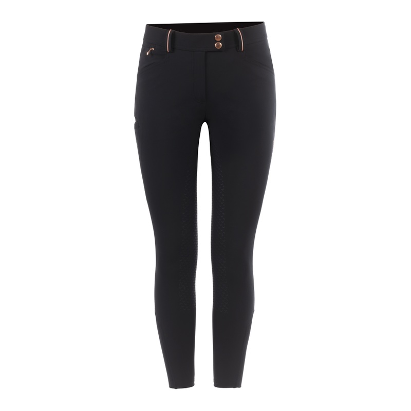 The breeches have a particularly comfortable outer fabric. There is piping on the belt loops and back welt pockets. Included are two front pockets, and a small coin pocket below the waistband. There is a mobile phone pocket on the right thigh, and high-quality nail head artwork on the left thigh.