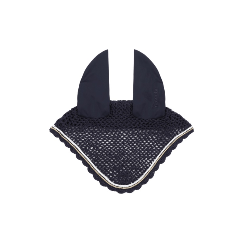 Fly hood made of quick-drying, skin-friendly functional jersey in the ear area.The left ear is embroidered with the Cavallo lettering.Head in crochet look.Edging with shape-retaining cord in white and a black tape with golden shimmering threads.