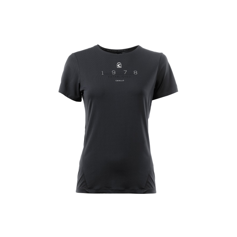 Cavallo SS23 Ladies Frizzi Round Neck T-Shirt - BLACKInsert made of structured material running from the back to the front for perfect air circulation and breathability.Large, elaborate, silver Cavallo artwork on the chest.Silver Cavallo artwork on the ins