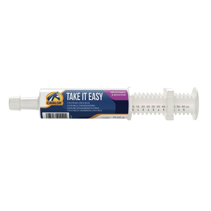 Cavalor Take It Easy is a syringed oral calmer paste for the reduction of stress reactions.Each 60g syringe contains a high dose of tryptophan, combined with Vitamins A, B3, E and magnesium to create a calming effect.Use 20-60ml before the stressful situat
