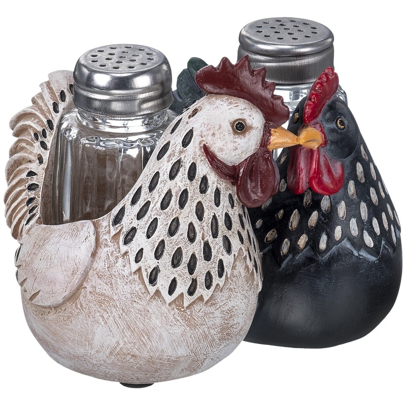These adorable chicken salt and pepper shakers are perfect for your farmhouse kitchen! Made of resin but made to look like real carved wood. Includes two glass shakers with screw top lids for easy refilling.Size:4 1/2" x 3 3/4" x 4"