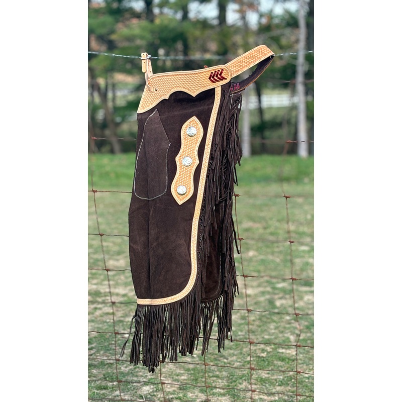 Showman Chocolate suede chinks with Argentina basket Stamp tooling. These chinks feature an Argentina cow leather accent leather and silver conchos. Easily adjust with a three-buckle closure on each leg and an adjustable buckle front.