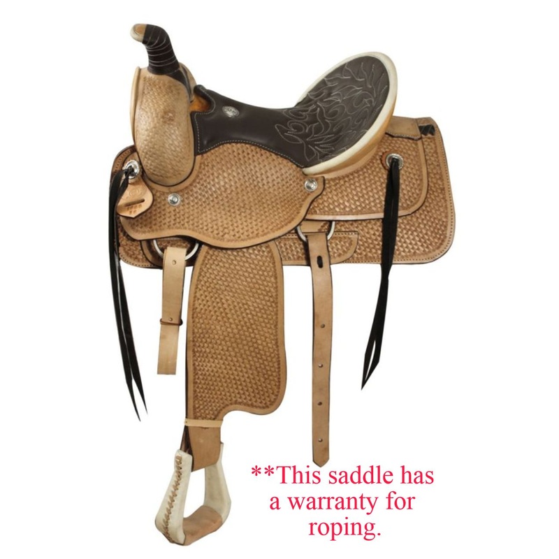 Fully tooled basketweave tooling, Roping Style saddle WITH a warranty for roping. Saddle features a smooth leather seat, rawhide around the cantle and horn, rawhide covered stirrups, with tooling in the seat. Comes complete with a latigo leather tie strap and off billet.