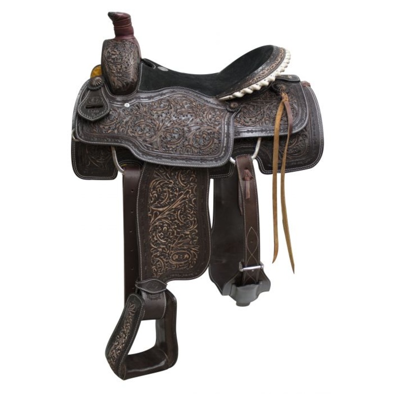 Features5-Year Roping WarrantyAbsolutely Stunning Hand-Tooled Unique Design All OverBrushed Copper Starburst Conchos Add Beautiful DetailPremium Bullhide Covered Hardwood Tree Molds To The Horse More Quickly Than It's Rawhide CounterpartPre-Wrapped Leather