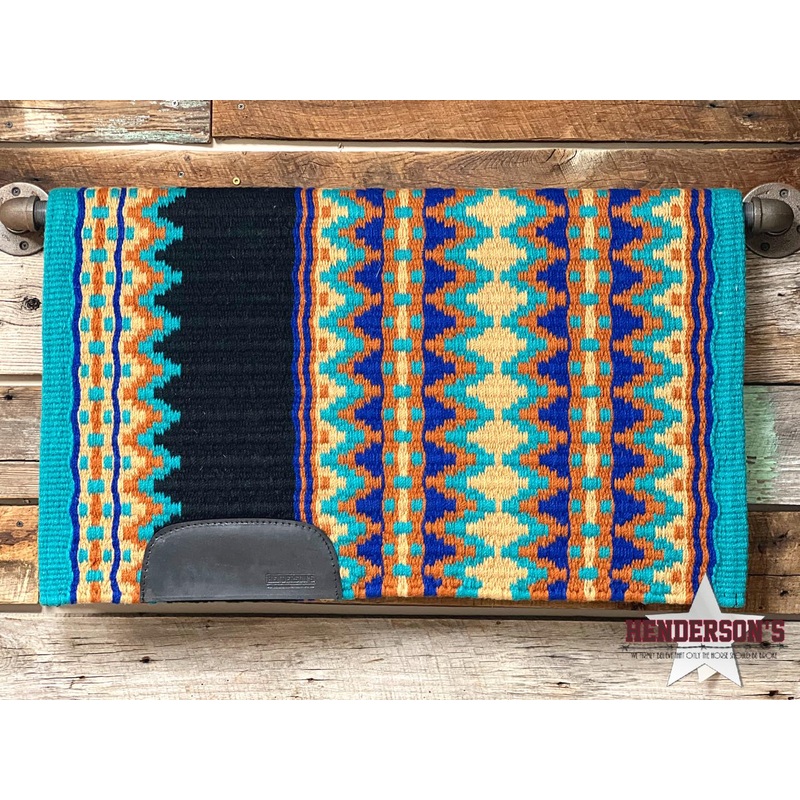 Western show pads by Henderson's. We have designed these pads to compliment your outfit in the show ring. All pads are made with 100% wool and are handwoven with wear leathers. All pad designs are copyright.Black base Rust, Tan, Royal Blue, Turquoise 34x40