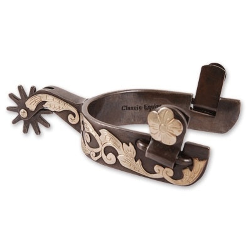 The Classic Equine Cutter Spur is made with greyed iron in classic cutter style. 2″ shank that turns down to avoid accidental contact with the horse. 1″ band is weighted to stay down on the heel. Large.