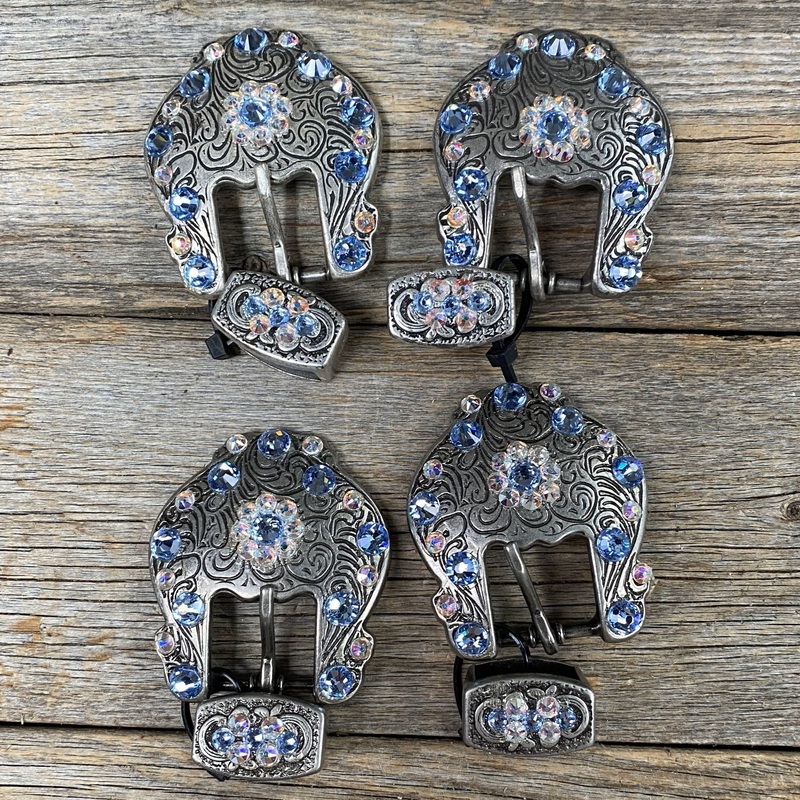 4- Antique Silver Light Sapphire/AB Fancy BucklesBuckle can fit 5/8" to 3/4" leatherPerfect for dog collars, spur straps, headstall, etc.Please note that all clearance items are final sale and are not eligible for return or exchange.