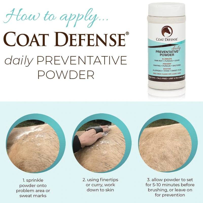 Coat Defense Daily Preventative PowderRain rot, fungus, thrush, scratches and odor.Soothesitchy and inflamed skin caused by insect bites, allergies, hives or sweet itch.Use to save timedryingmoisture and sweat in cold months.Preventchafing, rubs, fungus an