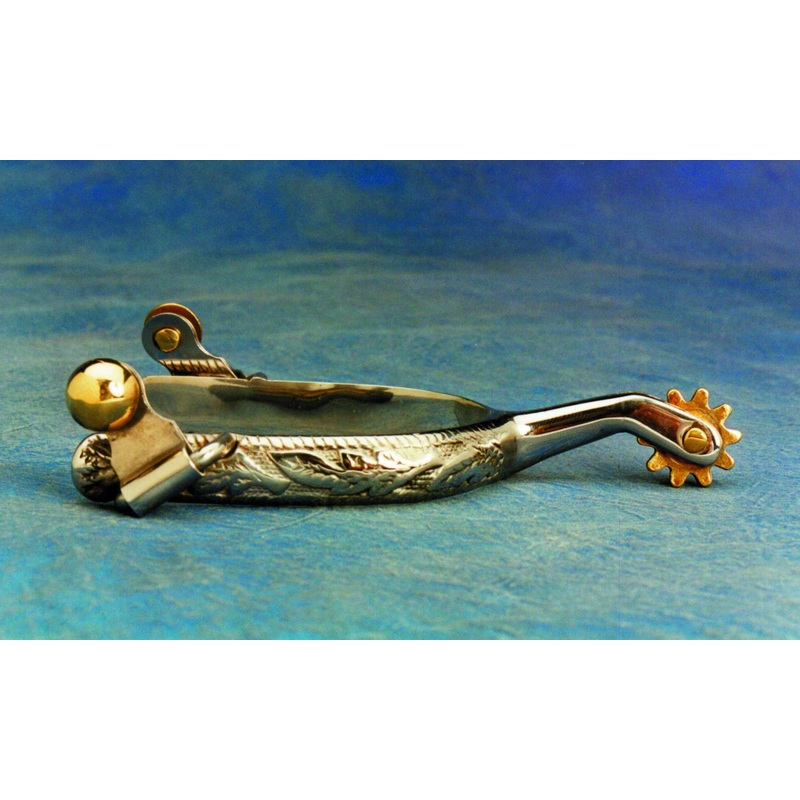The Colorado Saddlery Lady Roper Spurs are a great looking pair of ladies roping style spurs. They fit a boot well and and are designed to be used! Stainless steel ladies spur with a 1/2" engraved band, 7/8" brass rowels, brass buttons and a 1 1/4" goosene