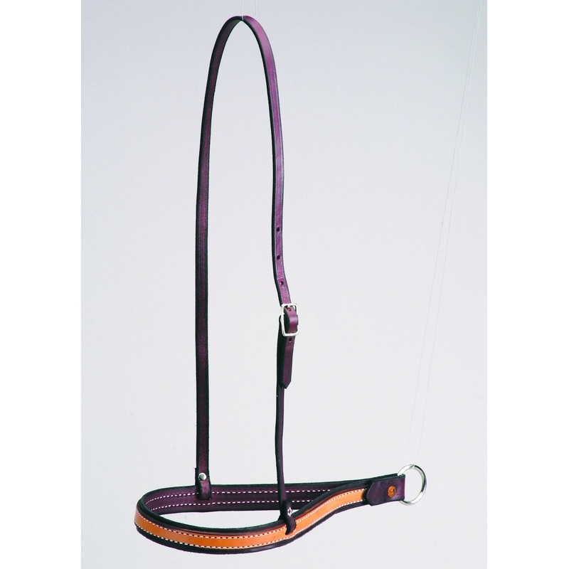 The Colorado Saddlery Leather Ropers Drop Nose Noseband is made of heavy 3/4" strap leather sewn over a double-folded piece of red latigo. It is hand riveted and includes a brass tiedown ring. 3/8" latigo headstall. Made in USA.