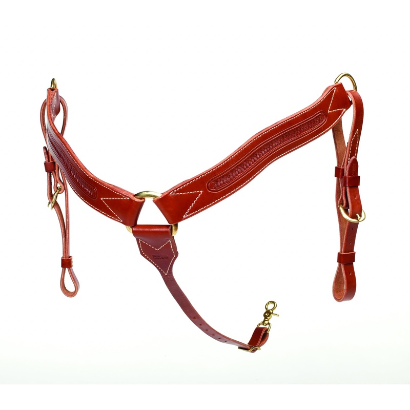 The Colorado Saddlery Mahogany Leather Border Tooled Breast Collar is a beautiful breast collar with a brass center dee and brass plated hardware. It is made from the finest Mahogany Saddle Skirting Leather and is two inches wide with a tapered tie down strap. This breast collar matches Colorado Saddlery’s Mahogany saddles.