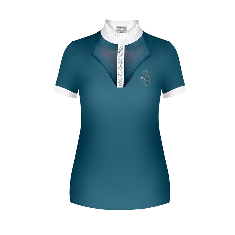 Fair Play Competition Shirt Sophie - this gorgeous short sleeve women's show shirt will complement your competition look what ever your discipline. Featuring a ruffled stand up collar, the shirt is incredibly elegant thanks to the elastic mesh inserts on t