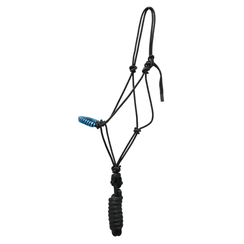 Coolhorse Black/Turquoise Braided Nose Rope Halter- 7' Black LeadCoolhorseBraided NosebandNylon leadPermanent knots at noseband and throat latchAttached 7 lead includedBlack and turquoise Braided nosebandThe Coolhorse Black/Turquoise Braided Nose Rope Halt