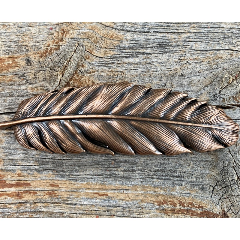 Copper western concho with afeathershape. This measures at 3".Perfect for headstalls, breastcollars, dog collars, etc.Chicago screws are included.