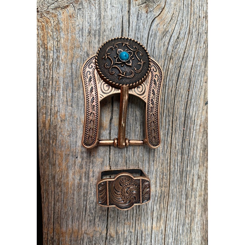 Copper floral etching with turquoise center western conchoPaired with our copper buckle adaptor and keeper.Measures 2"x 1.5" and fits 5/8" to 3/4"Perfect for headstalls, breastcollars, dog collars, etc.