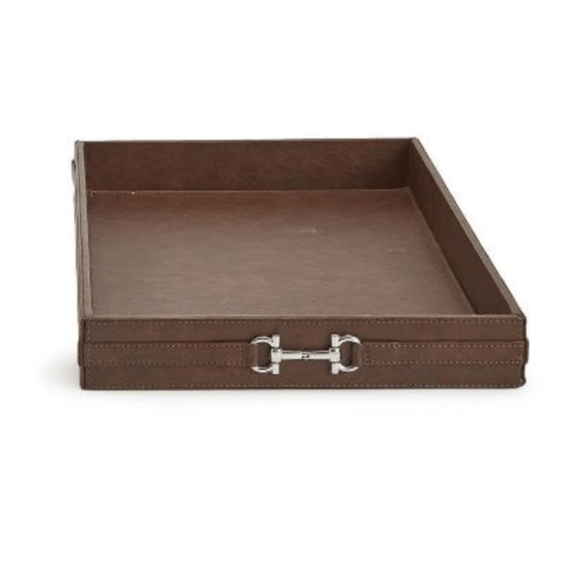 Introducing the Country Horse Decorative Tray - Large. A stylish and functional serving tray with a rich chocolate brown vegan leather and silver tone horse bit accent. Perfect for serving your favorite foods and drinks, organizing your desk, or as an entr