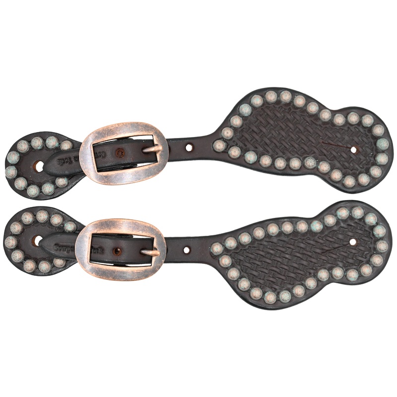 Cowperson Tack Ladies Chocolate Basket Stamped Spur Straps with Patina Turquoise SpotsBasket Stamped Chocolate Spur StrapsPatina Turquoise SpotsCopper BucklesSold as PairThese chocolate basket stamped ladies spur straps are about as classy as the person we