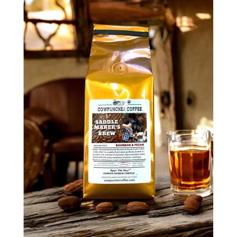 Cowpuncher Coffee Saddle Maker's Brew Bourbon & Pecan Medium Roast Coffee Grounds- 1lb100% Arabica CoffeeNatural & Artificial FlavorsMedium Roast, Ground, 1 pound/16 oz. (454G)Small Batch Roasted & Packaged in TexasHand - Roasted Kentucky Bourbon & Pecan C