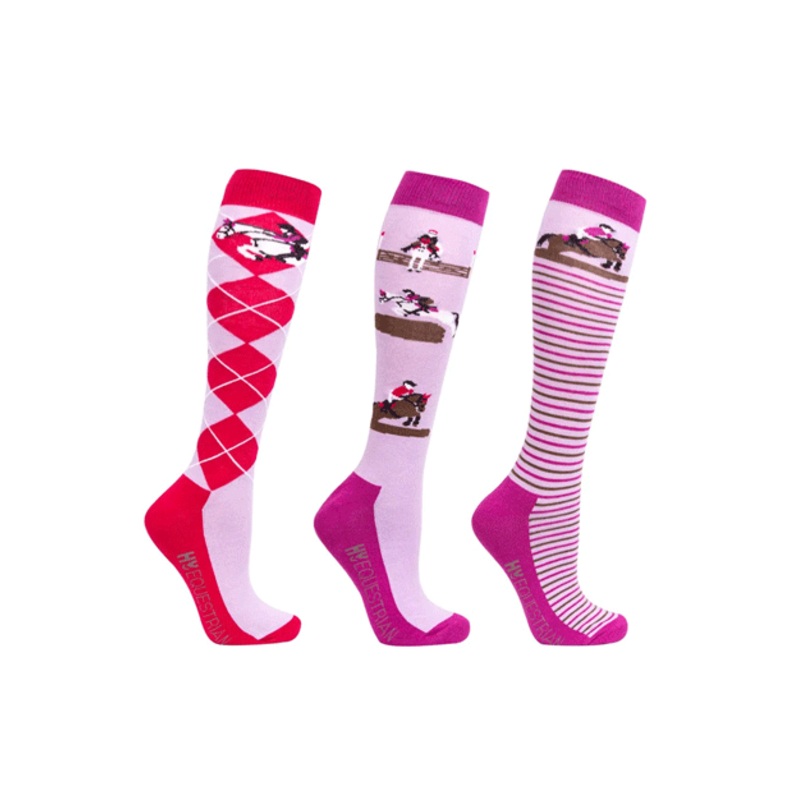 The second sock design features three horses jumping cross country fences on a purple background. The third sock has a classic argyle print with horse jumping at the top. Finished with Hy Equestrian logo on the sole and contrasting cuffs, toes and heels. The socks incorporate bamboo for its antibacterial properties to ensure your feet stay fresh all day long, plus padded soles for extra comfort.