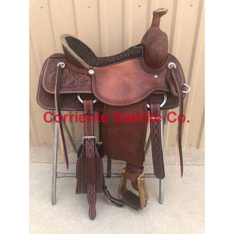 This saddle is built on a wooden rawhide covered tree and comes with a latigo, back flank, stirrups, back billits and offstrap. To order give us a call or email us and we will get started on one for you. We take Visa, Mastercard and Discover. We offer seat sizes 14″ inch, 14.5″ inch, 15″ inch, 15.5″ inch, 16″ inch, 16.5 inch, 17″ inch, and 18″ inch in this saddle. On any saddle, we can add your brand, custom lettering, upgraded conchos, upgraded stirrups, etc. Trophy lettering is available for $50 as well on any saddle.