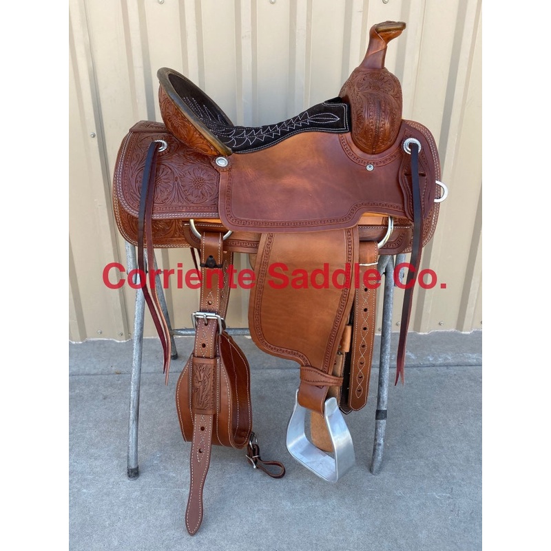 This saddle is built on a wooden rawhide covered tree and comes with a latigo, back flank, stirrups, back billits and offstrap. To order give us a call or email us and we will get started on one for you. We take Visa, Mastercard and Discover. We offer seat sizes 14″ inch, 14.5″ inch, 15″ inch, 15.5″ inch, 16″ inch, 16.5 inch, 17″ inch, and 18″ inch in this saddle. On any saddle, we can add your brand, custom lettering, upgraded conchos, upgraded stirrups, etc. Trophy lettering is available for $50 as well on any saddle.