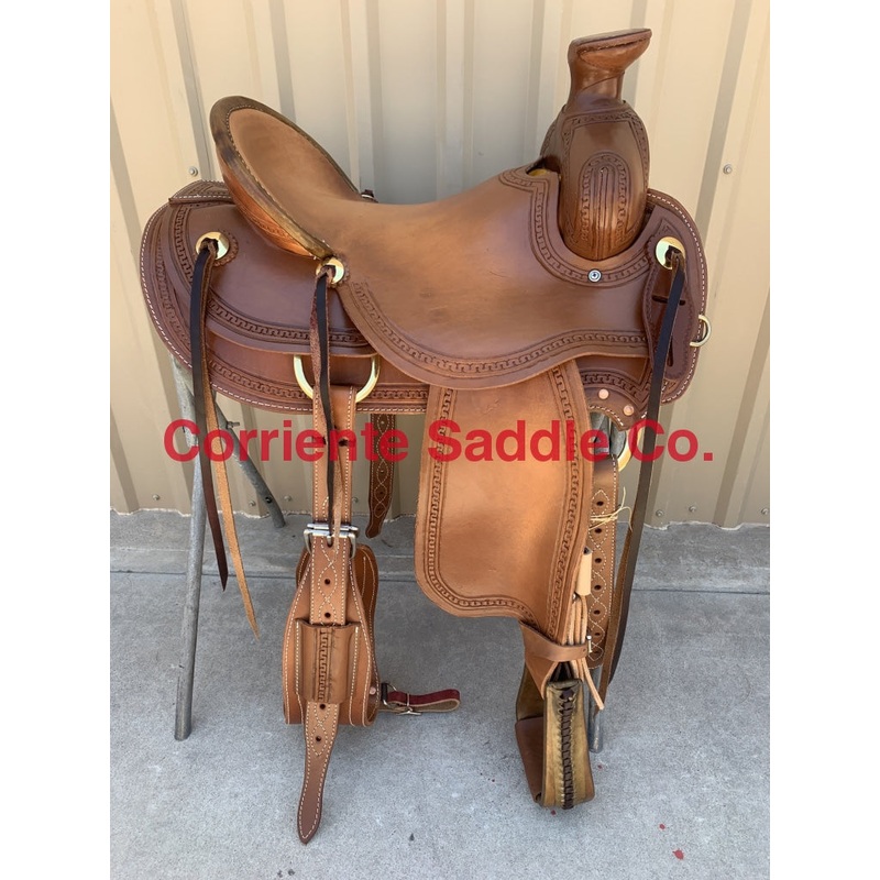 This saddle is built on a wooden rawhide covered tree and comes with a latigo, back flank, stirrups, back billits and offstrap. To order give us a call or email us and we will get started on one for you. We take Visa, Mastercard and Discover. We offer seat sizes 14″ inch, 14.5″ inch, 15″ inch, 15.5″ inch, 16″ inch, 16.5 inch, 17″ inch, and 18″ inch in this saddle. On any saddle, we can add your brand, custom lettering, upgraded conchos, upgraded stirrups, etc. Trophy lettering is available for $50 as well on any saddle.