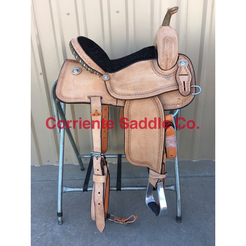 Rawhide Braided HornSilver Lace on Cantle BlackSeat with Rainbow StitchingPlain Barrel StirrupsSeat Can Be Changed To A Solid Color Suede Seat Of Your ChoiceFURTHER DETAILSThis saddle is built on a wooden rawhide covered tree and comes with a latigo, back flank, stirrups, back billets and offstrap. To order give us a call or email us and we will get started on one for you. We take Visa, Mastercard and Discover. We offer seat sizes 12″ inch, 12.5″ inch, 13″ inch, 13.5″ inch, 14″ inch, 14.5 inch, 15″ inch, 15.5″ inch, 16″ inch, 16.5″ inch and 17″ inch in this saddle. You can also choose between a 4″ inch or 5″ inch tall cantle. On any saddle, we can add your brand, custom lettering, upgraded conchos, upgraded stirrups, etc. Trophy lettering is available for $50 as well on any saddle.Seat can be changed to a solid color suede seat of your choice.