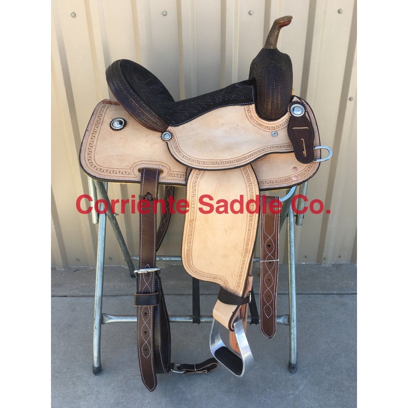Plain Barrel StirrupsSeat Can Be Changed To A Solid Color Suede Seat Of Your ChoiceFURTHER DETAILSThis saddle is built on a wooden rawhide covered tree and comes with a latigo, back flank, stirrups, back billets and offstrap. To order give us a call or email us and we will get started on one for you. We take Visa, Mastercard and Discover. We offer seat sizes 12″ inch, 12.5″ inch, 13″ inch, 13.5″ inch, 14″ inch, 14.5 inch, 15″ inch, 15.5″ inch, 16″ inch, 16.5″ inch and 17″ inch in this saddle. You can also choose between a 4″ inch or 5″ inch tall cantle. On any saddle, we can add your brand, custom lettering, upgraded conchos, upgraded stirrups, etc. Trophy lettering is available for $50 as well on any saddle.
