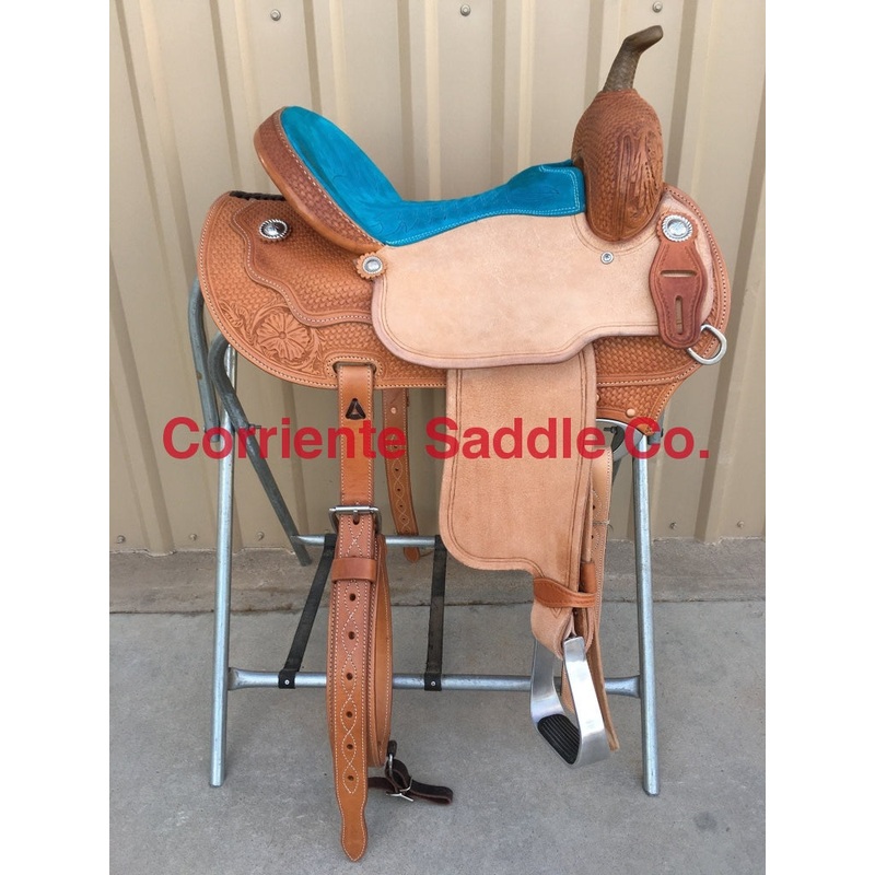 Real Wool Sheepskin LiningAvailable+$150BarrelSaddleHalf Breed RoughoutFloral + BasketToolingLineBorder Trim All Around SaddleRawhide Braided HornLeather Cheyenne Roll TurquoiseSeat with RainbowStitchingRound Skirts with Extra Layer on TopDrop Rigging with Fancy DeePlain Barrel StirrupsSeat Can Be Changed To A Solid Color Suede Seat Of Your ChoiceFURTHER DETAILSThis saddle is built on a wooden rawhide covered tree and comes with a latigo, back flank, stirrups, back billets and offstrap. To order give us a call or email us and we will get started on one for you. We take Visa, Mastercard and Discover. We offer seat sizes 12″ inch, 12.5″ inch, 13″ inch, 13.5″ inch, 14″ inch, 14.5 inch, 15″ inch, 15.5″ inch, 16″ inch, 16.5″ inch and 17″ inch in this saddle. You can also choose between a 4″ inch or 5″ inch tall cantle. On any saddle, we can add your brand, custom lettering, upgraded conchos, upgraded stirrups, etc. Trophy lettering is available for $50 as well on any saddle.Seat can be changed to a solid color suede seat of your choice.