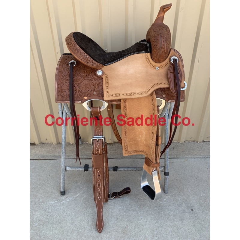 In-Skirt Fancy Dee Ring Front & Back90 Degree SkirtingLeather HornLeather Cheyenne Roll4 Strings Chocolate Seat with Rainbow StitchingPlain Barrel StirrupsSeat Can Be Changed To A Solid Color Suede Seat Of Your ChoiceFURTHER DETAILSThis saddle is built on a wooden rawhide covered tree and comes with a latigo, back flank, stirrups, back billets and offstrap. To order give us a call or email us and we will get started on one for you. We take Visa, Mastercard and Discover. We offer seat sizes 12″ inch, 12.5″ inch, 13″ inch, 13.5″ inch, 14″ inch, 14.5 inch, 15″ inch, 15.5″ inch, 16″ inch, 16.5″ inch and 17″ inch in this saddle. You can also choose between a 4″ inch or 5″ inch tall cantle. On any saddle, we can add your brand, custom lettering, upgraded conchos, upgraded stirrups, etc. Trophy lettering is available for $50 as well on any saddle.Seat can be changed to a solid color suede seat of your choice.