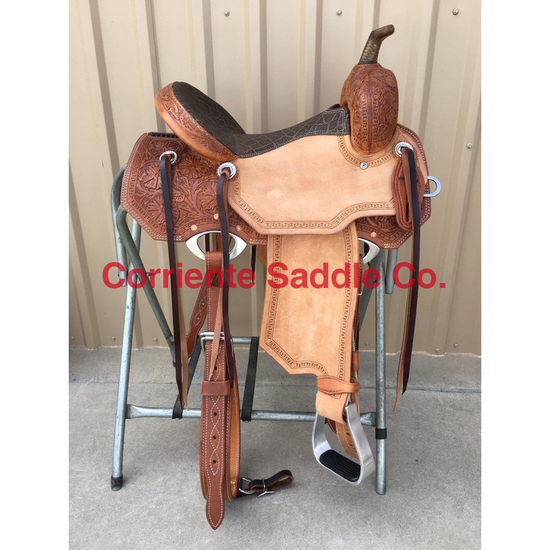 In-Skirt Fancy Dee Ring Front & Back45 Degree SkirtingRawhide Braided HornLeather Cheyenne Roll6 StringsImitation Elephant Seat+$50Plain Barrel StirrupsSeatCan Be Changed To A Solid Color Suede Seat Of Your ChoiceFURTHER DETAILSThis saddle is built on a wooden rawhide covered tree and comes with a latigo, back flank, stirrups, back billets and offstrap. To order give us a call or email us and we will get started on one for you. We take Visa, Mastercard and Discover. We offer seat sizes 12″ inch, 12.5″ inch, 13″ inch, 13.5″ inch, 14″ inch, 14.5 inch, 15″ inch, 15.5″ inch, 16″ inch, 16.5″ inch and 17″ inch in this saddle. You can also choose between a 4″ inch or 5″ inch tall cantle. On any saddle, we can add your brand, custom lettering, upgraded conchos, upgraded stirrups, etc. Trophy lettering is available for $50 as well on any saddle.Seat can be changed to a solid color suede seat of your choice.