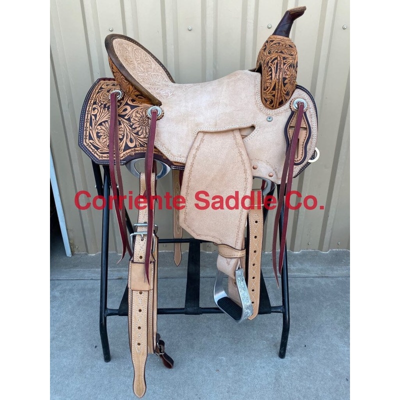 In-Skirt Fancy Dee Ring Front & Back45 Degree SkirtingLeatherHornStraight Up CantleTooledHard Seat6 StringsEngraved Barrel Stirrups+$10SeatCan Be Changed To A Solid Color Suede Seat Of Your ChoiceFURTHER DETAILSThis saddle is built on a wooden rawhide covered tree and comes with a latigo, back flank, stirrups, back billets and offstrap. To order give us a call or email us and we will get started on one for you. We take Visa, Mastercard and Discover. We offer seat sizes 12″ inch, 12.5″ inch, 13″ inch, 13.5″ inch, 14″ inch, 14.5 inch, 15″ inch, 15.5″ inch, 16″ inch, 16.5″ inch and 17″ inch in this saddle. You can also choose between a 4″ inch or 5″ inch tall cantle. On any saddle, we can add your brand, custom lettering, upgraded conchos, upgraded stirrups, etc. Trophy lettering is available for $50 as well on any saddle.Seat can be changed to a solid color suede seat of your choice.