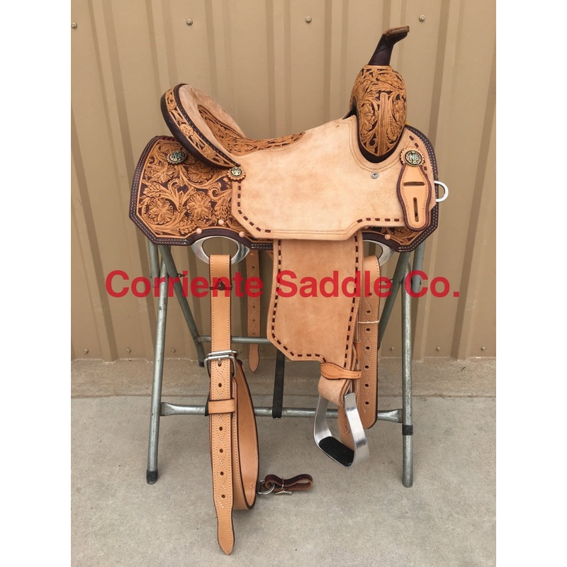 SeatCan Be Changed To A Solid Color Suede Seat Of Your ChoiceFURTHER DETAILSThis saddle is built on a wooden rawhide covered tree and comes with a latigo, back flank, stirrups, back billets and offstrap. To order give us a call or email us and we will get started on one for you. We take Visa, Mastercard and Discover. We offer seat sizes 12″ inch, 12.5″ inch, 13″ inch, 13.5″ inch, 14″ inch, 14.5 inch, 15″ inch, 15.5″ inch, 16″ inch, 16.5″ inch and 17″ inch in this saddle. You can also choose between a 4″ inch or 5″ inch tall cantle. On any saddle, we can add your brand, custom lettering, upgraded conchos, upgraded stirrups, etc. Trophy lettering is available for $50 as well on any saddle.Seat can be changed to a solid color suede seat of your choice.