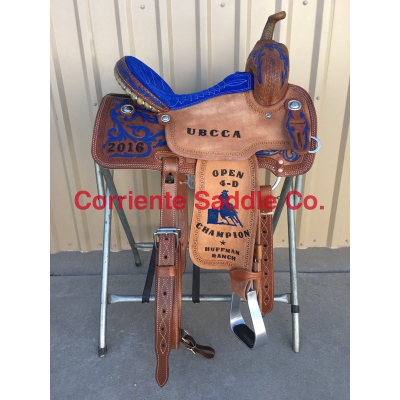 Tribal ToolingTribal PaintedRoyal Blue Running W Trim All Around SaddleRawhide BraidedHornSilver Lace on CantleRoyal BlueSeat with WhiteStitchingPlain Barrel StirrupsTrophy Lettering+$50**Saddle Can Be Made Without Lettering**SeatCan Be Changed To A Solid Color Suede Seat Of Your ChoiceFURTHER DETAILSThis saddle is built on a wooden rawhide covered tree and comes with a latigo, back flank, stirrups, back billets and offstrap. To order give us a call or email us and we will get started on one for you. We take Visa, Mastercard and Discover. We offer seat sizes 12″ inch, 12.5″ inch, 13″ inch, 13.5″ inch, 14″ inch, 14.5 inch, 15″ inch, 15.5″ inch, and 16″ inch in this saddle. On any saddle, we can add your brand, custom lettering, upgraded conchos, upgraded stirrups, etc. Trophy lettering is available for $50 as well on any saddle.Seat can be changed to a solid color suede seat of your choice. Tribal tooling can be painted the color of your choice. Tribal tooling can be painted the color of your choice.