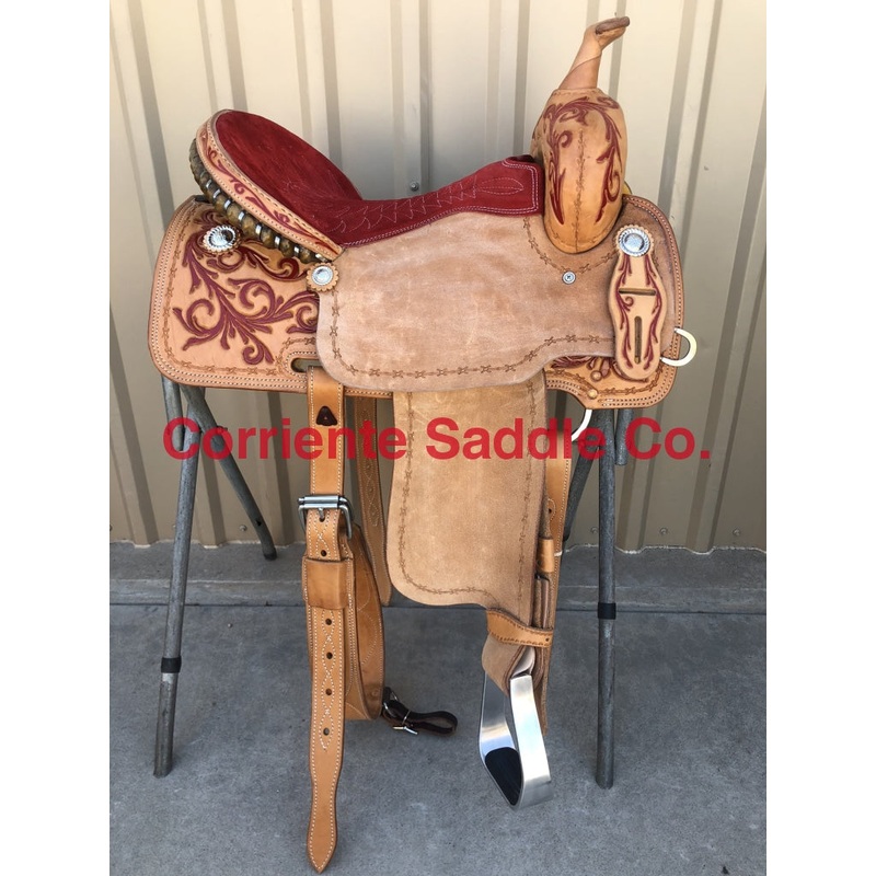 Tribal ToolingTribal PaintedRed Barb Wire Trim All Around SaddleLeather HornSilver Lace on CantleRedSeat with RainbowStitchingPlain Barrel StirrupsSeatCan Be Changed To A Solid Color Suede Seat Of Your ChoiceFURTHER DETAILSThis saddle is built on a wooden rawhide covered tree and comes with a latigo, back flank, stirrups, back billets and offstrap. To order give us a call or email us and we will get started on one for you. We take Visa, Mastercard and Discover. We offer seat sizes 12″ inch, 12.5″ inch, 13″ inch, 13.5″ inch, 14″ inch, 14.5 inch, 15″ inch, 15.5″ inch, and 16″ inch in this saddle. On any saddle, we can add your brand, custom lettering, upgraded conchos, upgraded stirrups, etc. Trophy lettering is available for $50 as well on any saddle.Seat can be changed to a solid color suede seat of your choice. Tribal tooling can be painted the color of your choice. Tribal tooling can be painted the color of your choice.