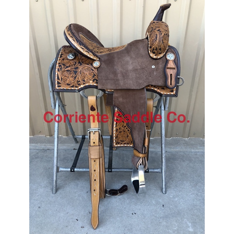 In-Skirt Fancy Dee Ring Front & Back90 Degree SkirtingLeather HornLeather Cheyenne Roll Inlaid Tooled SeatPlain Barrel Stirrups**Choice of Conchos Included**SeatCan Be Changed To A Solid Color Suede Seat Of Your ChoiceFURTHER DETAILSThis saddle is built on a wooden rawhide covered tree and comes with a latigo, back flank, stirrups, back billets and offstrap. To order give us a call or email us and we will get started on one for you. We take Visa, Mastercard and Discover. We offer seat sizes 12″ inch, 12.5″ inch, 13″ inch, 13.5″ inch, 14″ inch, 14.5 inch, 15″ inch, 15.5″ inch, and 16″ inch in this saddle. On any saddle, we can add your brand, custom lettering, upgraded conchos, upgraded stirrups, etc. Trophy lettering is available for $50 as well on any saddle.Seat can be changed to a solid color suede seat of your choice.