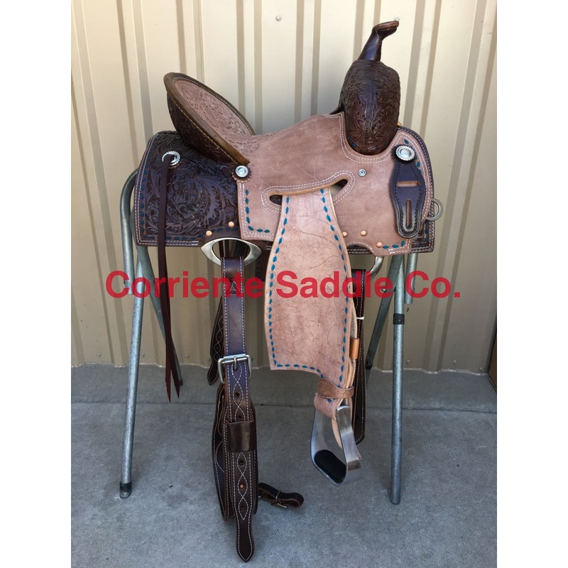 Plain Barrel Stirrups**Your Choice of Custom Conchos Included**SeatCan Be Changed To A Solid Color Suede Seat Of Your ChoiceFURTHER DETAILSThis saddle is built on a wooden rawhide covered tree and comes with a latigo, back flank, stirrups, back billets and offstrap. To order give us a call or email us and we will get started on one for you. We take Visa, Mastercard and Discover. We offer seat sizes 12″ inch, 12.5″ inch, 13″ inch, 13.5″ inch, 14″ inch, 14.5 inch, 15″ inch, 15.5″ inch, and 16″ inch in this saddle. On any saddle, we can add your brand, custom lettering, upgraded conchos, upgraded stirrups, etc. Trophy lettering is available for $50 as well on any saddle.Seat can be changed to a solid color suede seat of your choice.